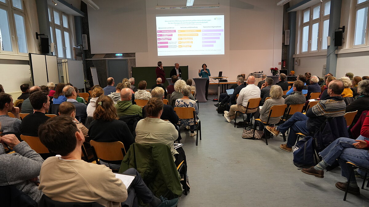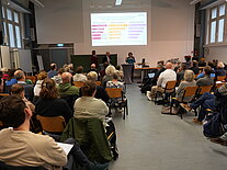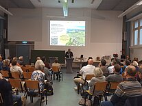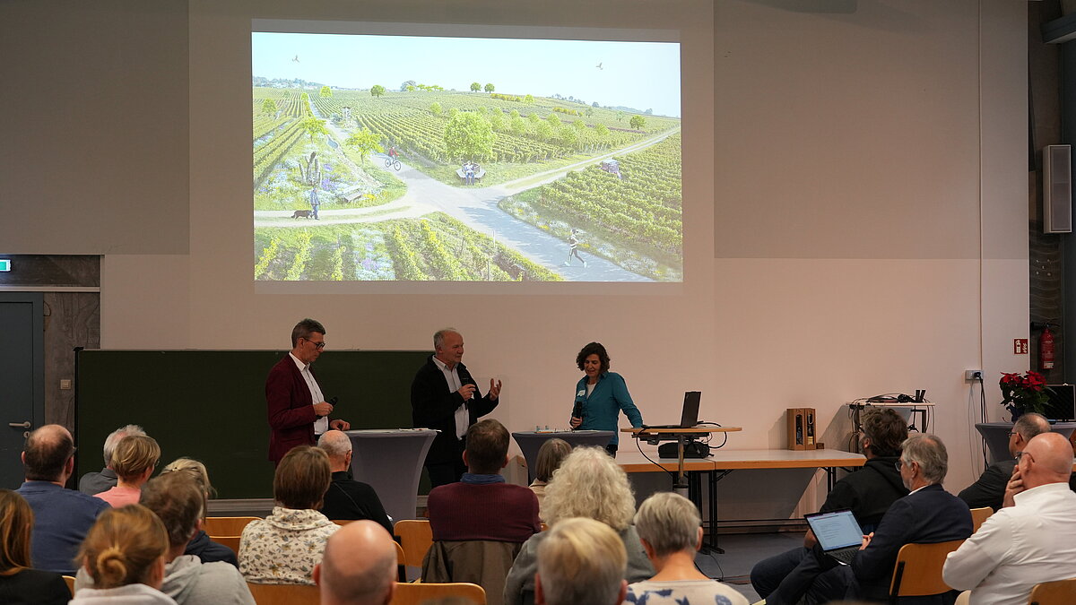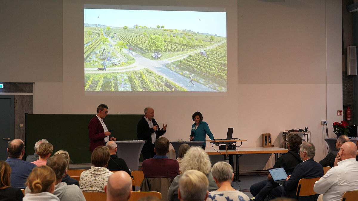 Durch das Programm führte Dr. Verena Rossow vom Institut für sozial-ökologische Forschung (ISOE), das Projektpartner bei GeisTreich ist. Prof. Klaus Werk, Vorsitzender der Bürgerstiftung, und Prof. Dr. Hans Reiner Schultz, Präsident der Hochschule Geisenheim, stimmten auf die thematischen Schwerpunkte ein. In einem gemeinsamen Vortrag hoben die Professor:innen Manfred Stoll (Weinbau), Ilona Leyer (Ökologie) und Eckhard Jedicke (Kulturlandschaft) hervor, dass der gegenwärtige Wandel im Weinbau auch Chancen mit sich bringe: Durch die freigewordenen Flächen entstünden Möglichkeiten, die Landschaft als Produktions-, Erholungs- und Lebensraum weiterzuentwickeln und den Herausforderungen der Klimakrise besser gerecht zu werden. Das Animationsvideo ‚Landschaft ist veränderbar‘ (abrufbar u. a. auf YouTube) veranschaulicht diese Vision beispielhaft: eine Weinbergsflur, die sich von einer monotonen Landschaft zu einem abwechslungsreichen und attraktiven Raum entwickelt, der neben der Traubenproduktion vielfältige Funktionen erfüllt.