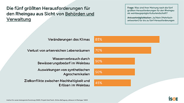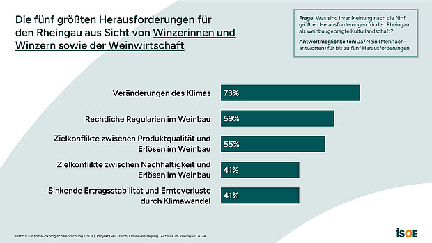 Neben den Veränderungen des Klimas benennen Winzerinnen, Winzer sowie die Weinwirtschaft vor allem ökonomische und rechtliche Herausforderungen als zentral für den Rheingau.