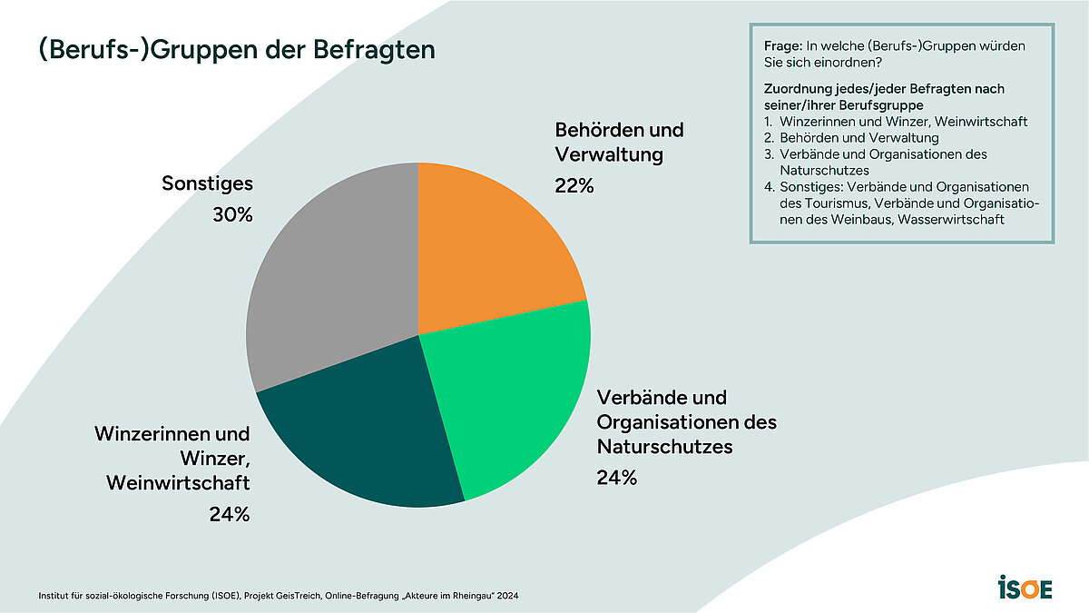 Die Online-Befragung richtete sich an alle Akteure des Rheingaus, die den Bereichen Weinwirtschaft, Naturschutz, Verwaltung und Verbände angehören. Beworben wurde die Befragung über verschiedene Newsletter und lokale E-Mail-Verteiler wie dem Rheingauer Weinbauverband, KliaNet (Kooperationen zur Klimaanpassung im Rheingau), Zweckverband. Die Teilnahme war möglich zwischen dem 05. Juli und dem 11. September 2024. Pro Fragebogen waren ca. 10-20 Minuten Bearbeitungsdauer vorgesehen. Es wurden 92 vollständig ausgefüllte Fragebögen zurückgesandt (= Stichprobengröße). Die Befragten wurden anhand ihrer Angaben zum Beruf in drei Gruppen eingeordnet.