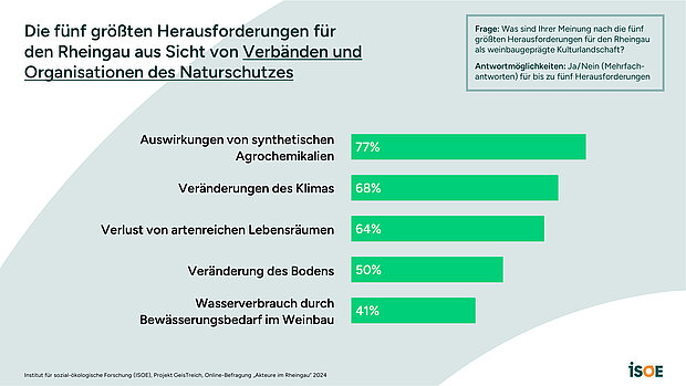 Um hierauf Antworten auf diese Fragen zu finden, hat das Institut für sozial-ökologische Forschung (ISOE) gemeinsam mit der Hochschule Geisenheim (HGU) eine Online-Befragung mit regionalen Akteuren durchgeführt. Im Fokus standen dabei neben den aktuellen Herausforderungen der Akteure im Rheingau die zukünftige Entwicklung der Kulturlandschaft.